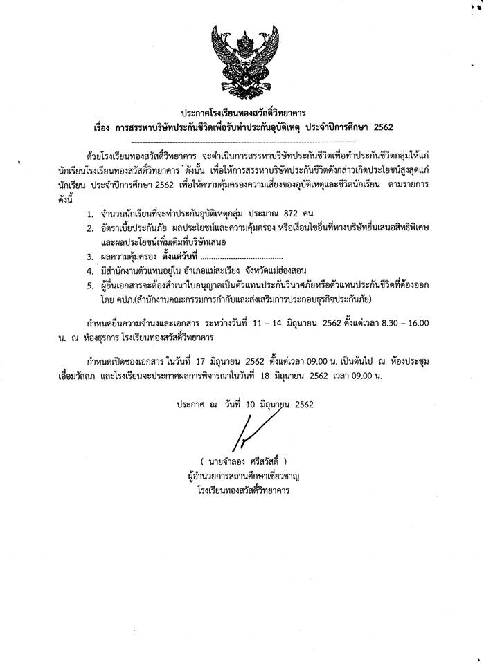 โรงเรียนทองสวัสดิ์วิทยาคารจะสรรหาบริษัทประกันชีวิตอุบัติเหตุกลุ่ม บริษัทประกันชีวิตแห่งไหนสนใจ ติดต่